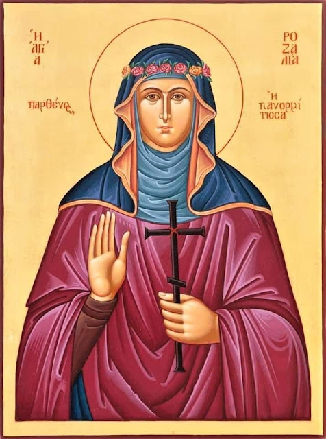 Μνήμη της ευρέσεως των ιερών λειψάνων της Οσίας μητρός ημών Ροζαλίας της εν Πανόρμω της Σικελίας. Ημέρα Μνήμης: 15 Ιουλίου.